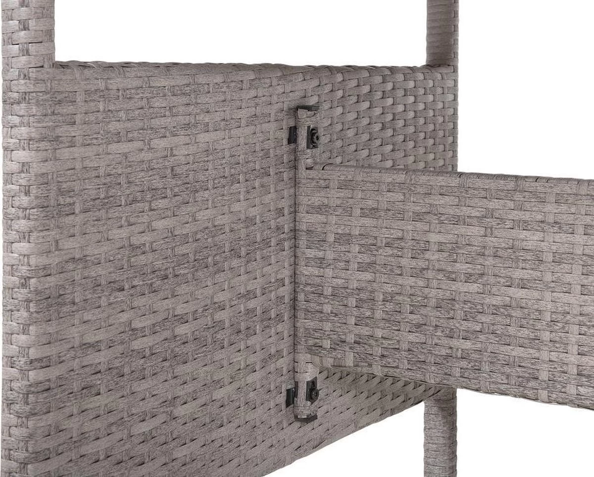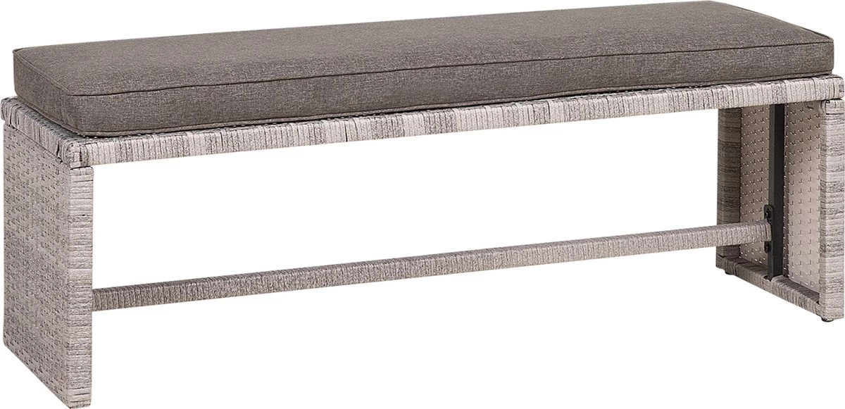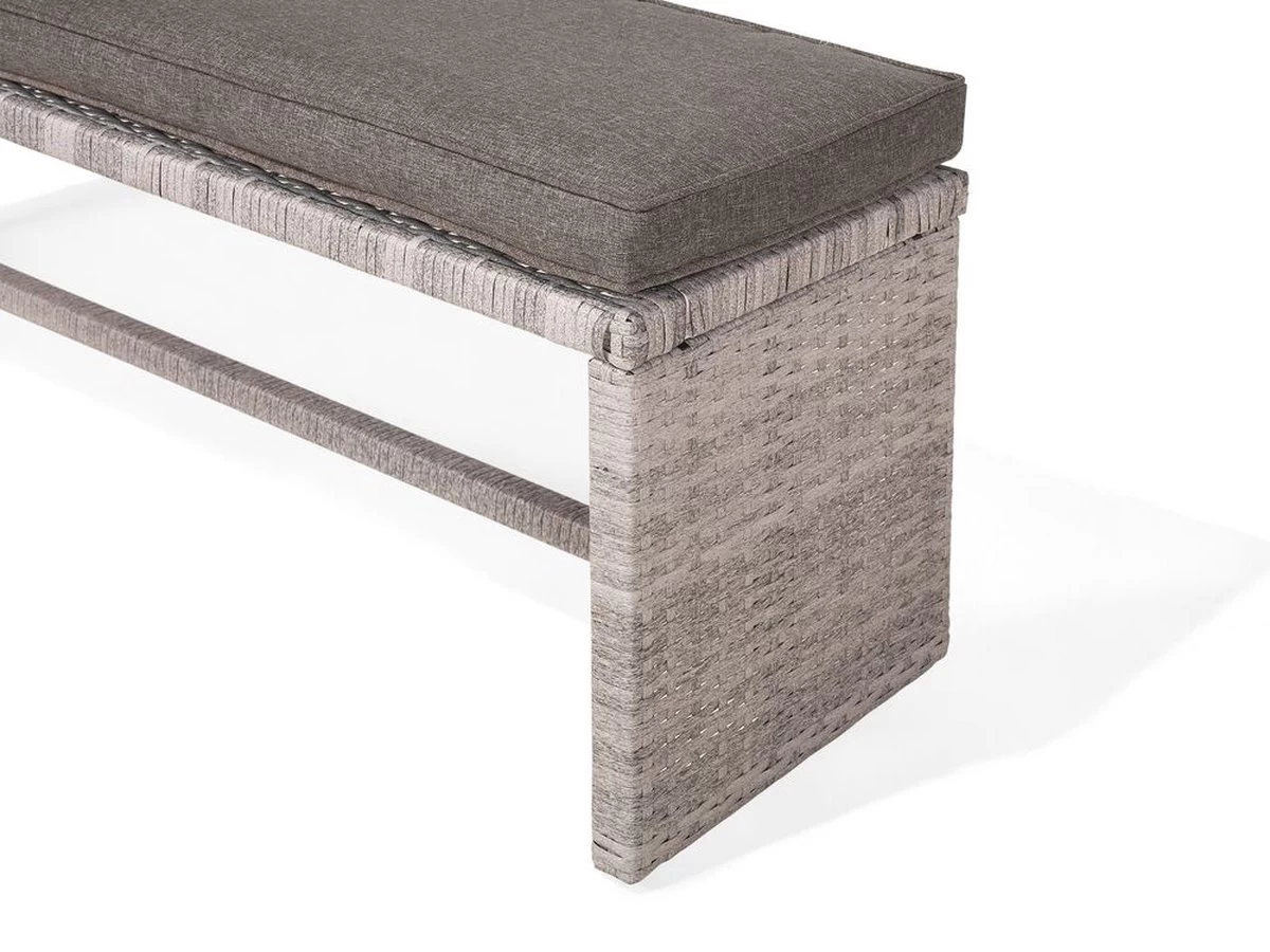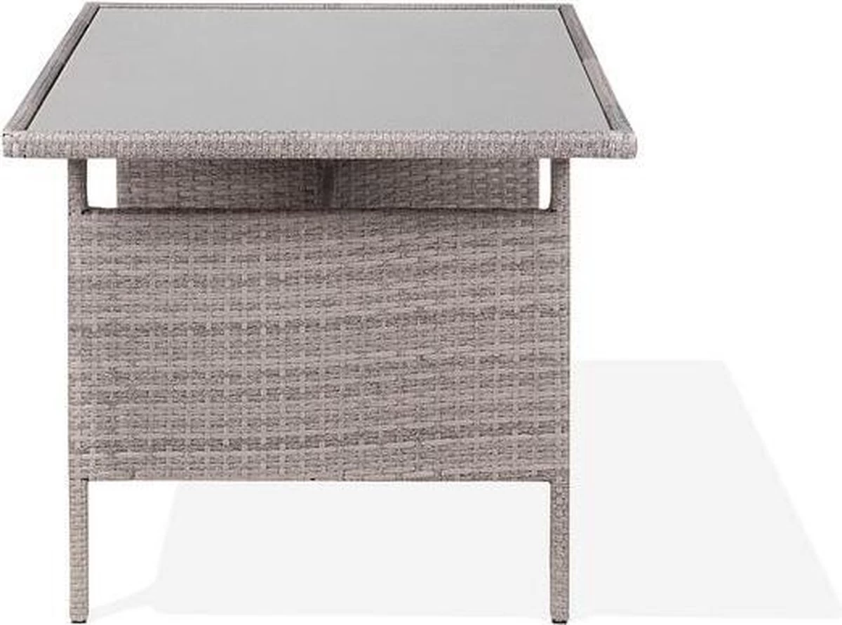 Elegante loungeset met praktische eettafel. Tijdloze sfeer voor lange zomeravonden met familie en vrienden. Deze robuuste en tegelijkertijd gezellige lounge set gemaakt van grijs polyrattan is weersbestendig en slijtvast en dankzij de grote hoekbank en de praktische bank biedt deze ruimte genoeg voor maximaal 8 personen. De ruime en iets hogere tafel dient niet alleen als opslagruimte voor drankjes, maar is ook perfect als eettafel.