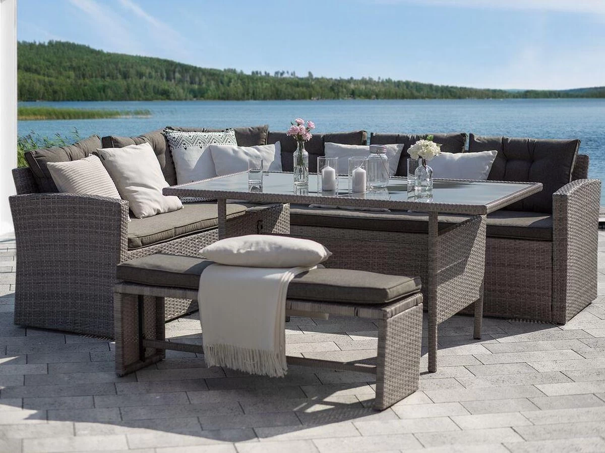 Key Features: Perfect voor het samenkomen met familie en vrienden, Gezellig en comfortabel, Modern terras- en tuinmeubilair, Lichtgewicht, duurzaam materiaal, UV-bestendigheidsklasse 4 (ISO 105-B05), Verwijderbare kussenhoezen, Robuust tafelblad gemaakt van veiligheidsglas