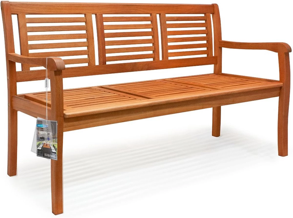 De weerbestendige 3-zits tuinbank is gemaakt van eucalyptushout en voorgeolied. Dankzij de rugleuning en de armleuningen is het comfortabel zitten. Ideaal voor balkon en terras. Maak het jezelf gemakkelijk en geniet van de zomer op het terras of in de tuin.