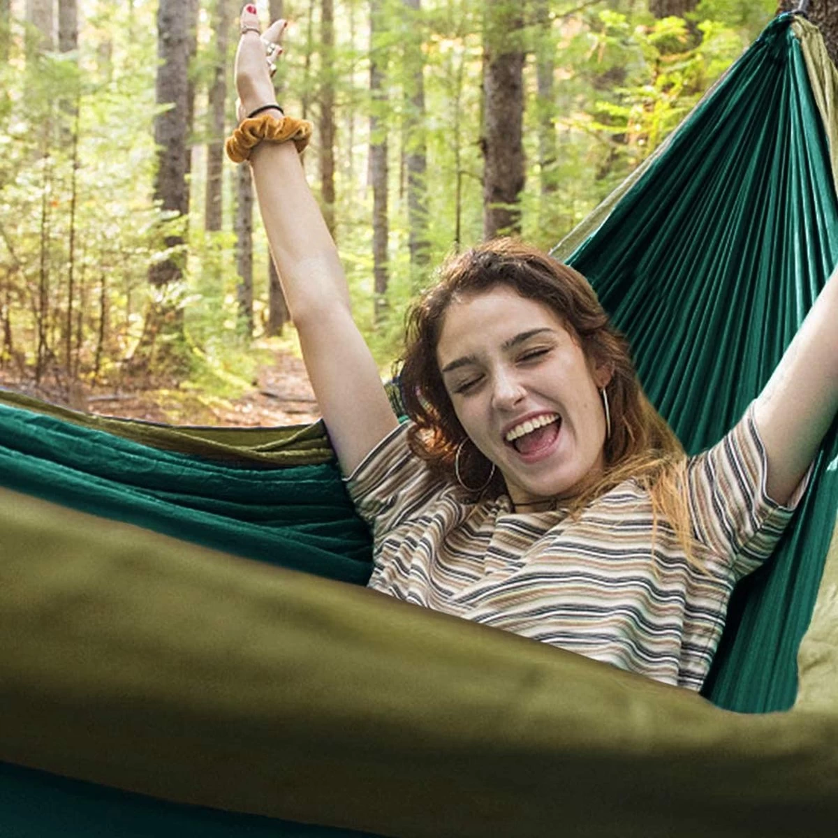 - Betrouwbaar parachute nylon: deze hangmat is gemaakt van parachute nylon. Deze stof staat bekend als extra licht, zacht voor je huid, grote scheurweerstand en weinig (opberg)omvang. Tegelijkertijd is het sterk en betrouwbaar en ziet het er stoer en solide uit. Bovendien droogt de stof snel, ideaal na een duik in het water, een regenbui of bij een laagje ochtenddauw.