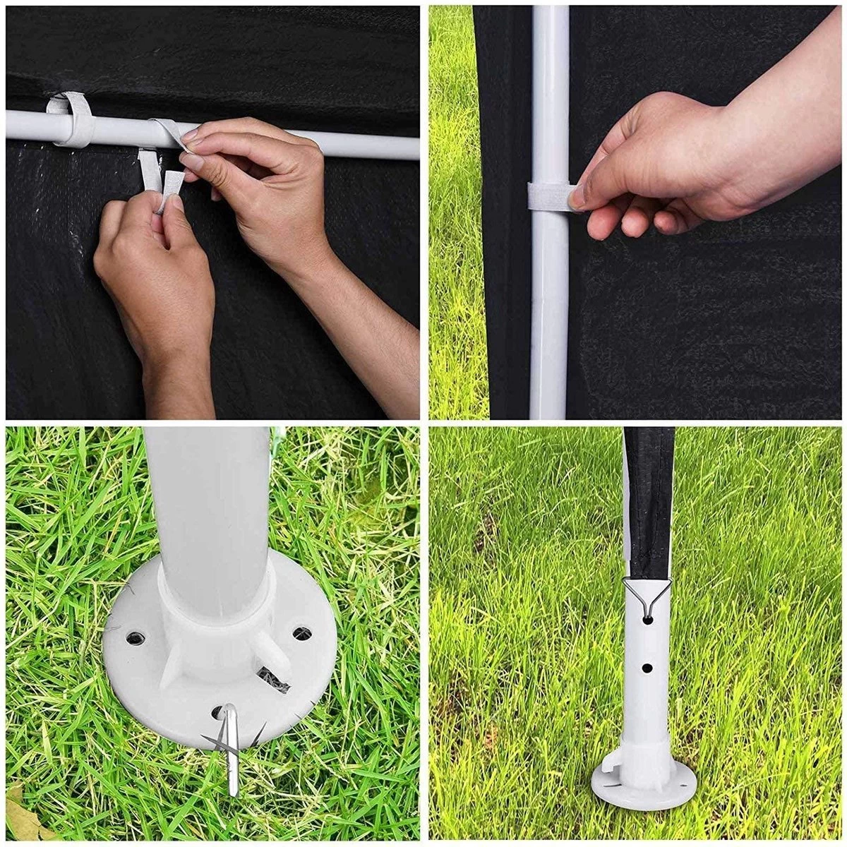Door het spanzeil en de haringen is het gestel binnen enkele minuten volledig opgebouwd.