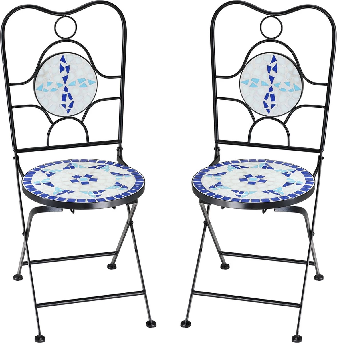 Het uitvoerig bewerkte tafelblad is gemaakt van zwaar steenmozaïek en staat op een stabiel, stalen frame. De stoelen zijn inklapbaar en gemakkelijk op te bergen.