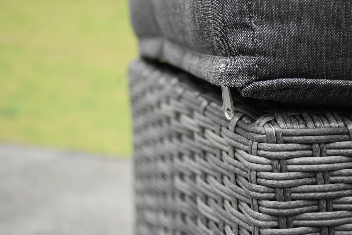 Het vlechtwerk is gemaakt van polyethyleen. Dit is een kunststof vlechtwerk dat ook wel wicker wordt genoemd. U kunt de loungeset dus altijd buiten laten staan.