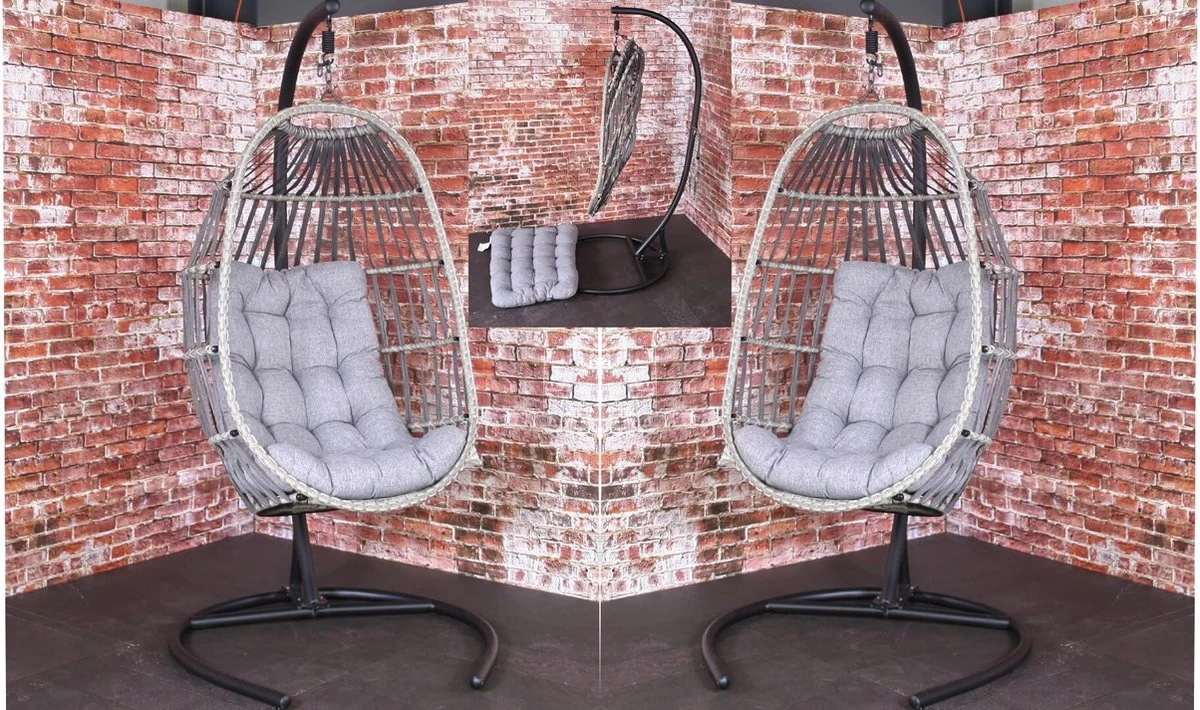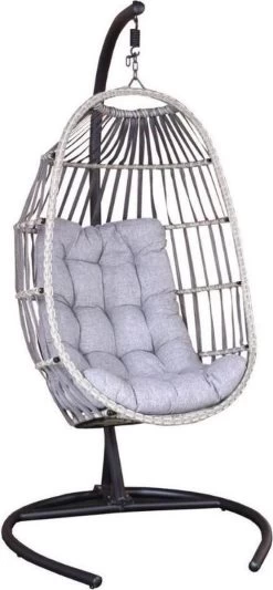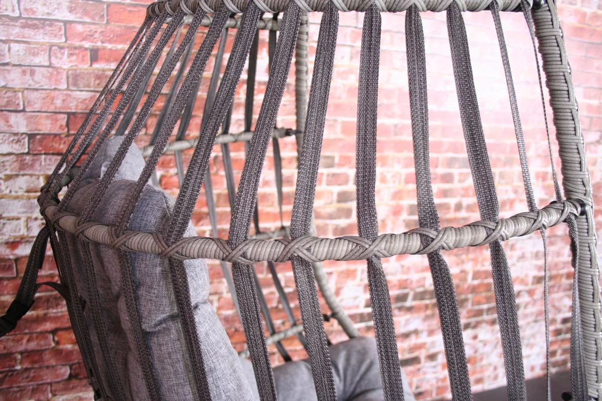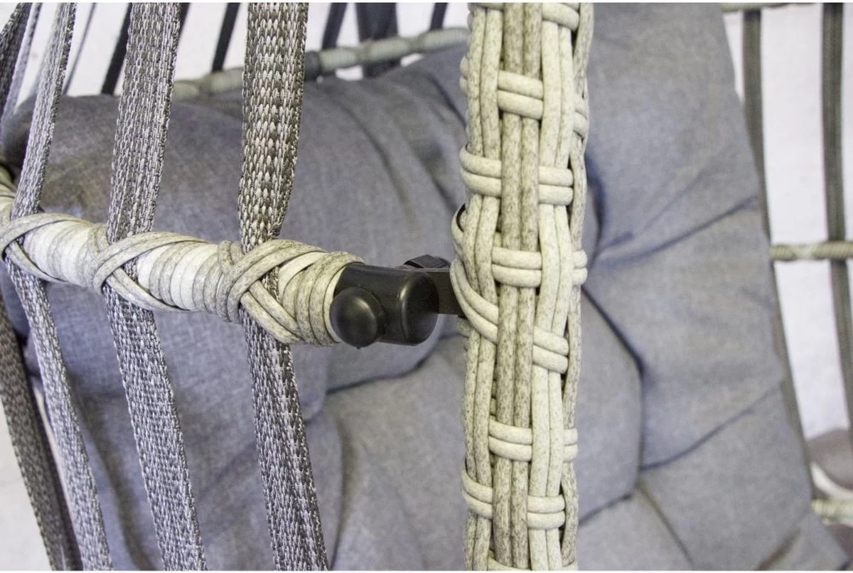 Het design van deze hangstoel kenmerkt zich door heeft een stevige stalen frame en de opvouwbare zitting van gevlochten wicker en touw. Het kussen is uitneembaar, handig als de stoel buiten staat. Bij langdurig slecht weer kun je de stoel het beste afdekken of binnen zetten om roesten te voorkomen en de levensduur van het item te verlengen.