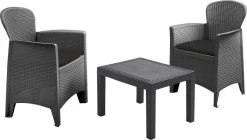 De tuinmeubelset bestaat uit een tafel, 2 stoelen en 2 comfortabele kussens. De balkonset heeft een comfortabele en stevige constructie. De tuinset heeft een rattan-effect, waardoor hij er indrukwekkend uitziet en hij gemakkelijk te onderhouden is.